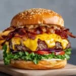 This classic grilled burger recipe features juicy, perfectly seasoned 80/20 ground beef patties cooked over medium-high heat and topped with a flavorful secret sauce made from mayonnaise, ketchup, relish, Worcestershire sauce, and seasoned salt. Served on toasted sesame seed buns, these burgers are an irresistible backyard favorite perfect for any cookout or casual meal.