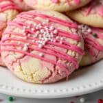 A close-up view of a group of thick, soft cookies laid on a white plate with a dotted edge. The cookies have a marbled pattern blending pale cream and pink colors with a cracked texture on the surface. One cookie prominently in the front is decorated with smooth pink icing drizzled in thin stripes and topped with small round sprinkles in white and shades of pink. More cookies with similar marbled patterns and sprinkled texture are stacked slightly behind. Tiny colorful round sprinkles in red, white, and green are scattered around the plate on a white marbled surface. photo taken with an iphone --ar 4:5 --v 7