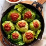 Store leftover cabbage rolls in an airtight container in the refrigerator for up to 4 days. Reheat in the oven at 350°F (175°C) covered with foil until heated through, about 20 minutes. They also freeze well—wrap individually and freeze for up to 3 months. Thaw overnight in the fridge before reheating.
