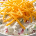 A close-up of a white bowl filled with a creamy mixture that has visible small red and green vegetable pieces mixed within a thick white base, topped with a generous layer of bright yellow shredded cheddar cheese, giving a textured look with soft creaminess underneath and the cheese strands scattered unevenly on top, all set against a white marbled texture surface in soft natural light. photo taken with an iphone --ar 4:5 --v 7