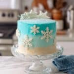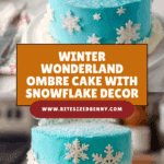 Keywords: Winter Wonderland Cake, Ombre Cake, Vanilla Cake, Blue Frosting Cake, White Chocolate Snowflake Cake, Festive Cake
